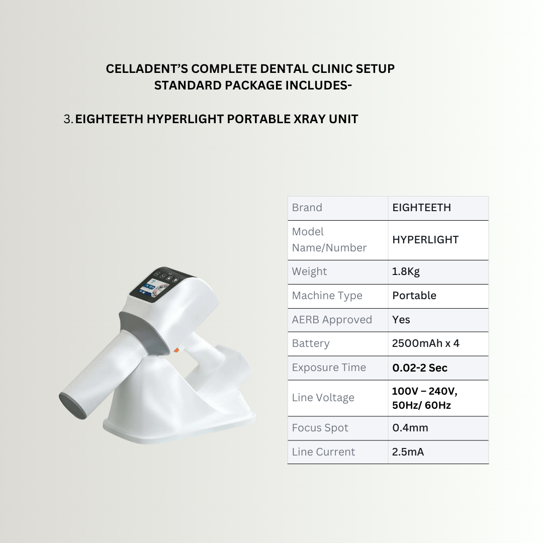 - Eighteeth Hyperlight Portable X-Ray: A cordless, lightweight (1.8kg) DC X-ray unit. Featuring a 0.4mm focal spot for razor-sharp images and a built-in lead shield for maximum operator safety.