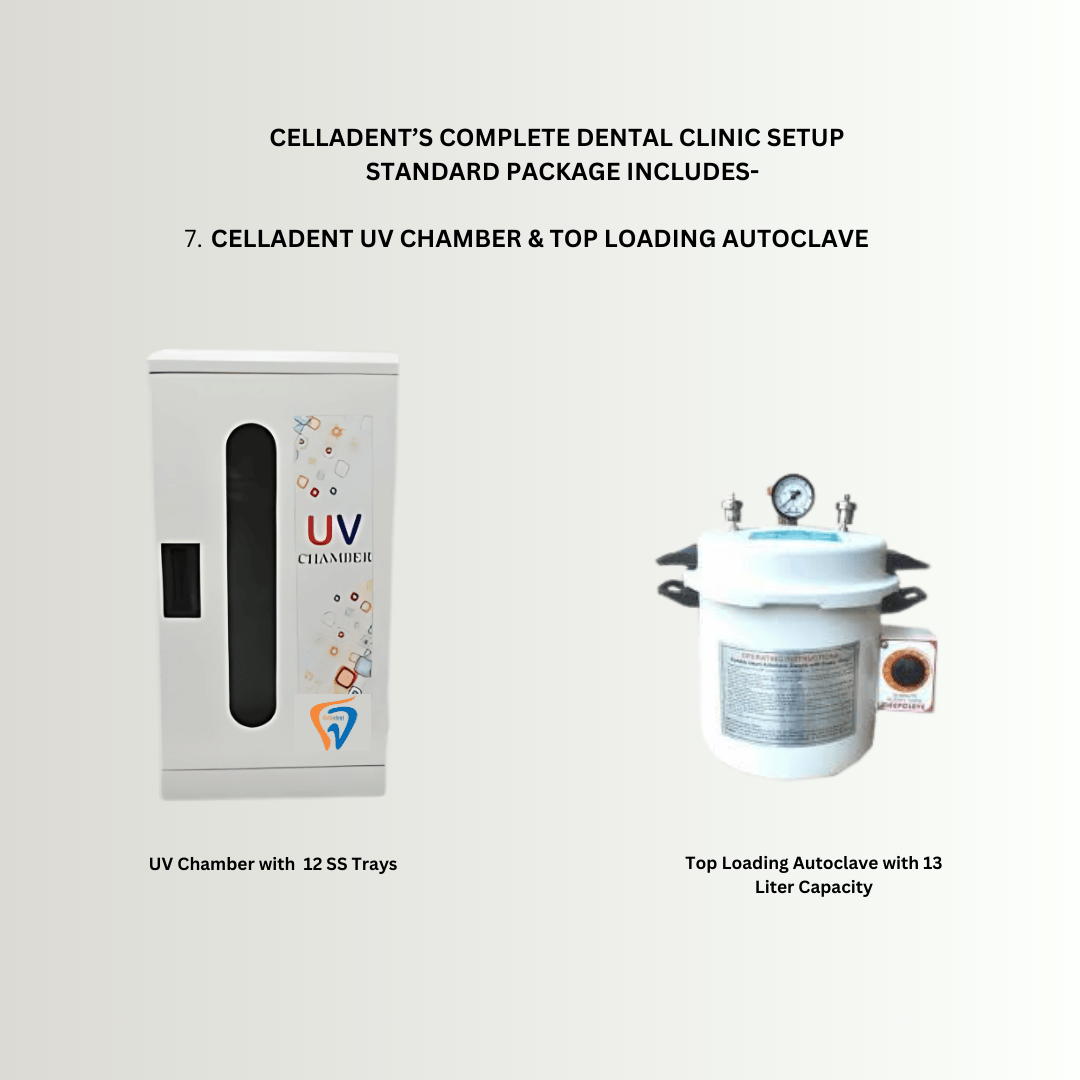 - CELLADENT Sterilization Trio: * 13L Top-Loading Autoclave for rapid sterilization.