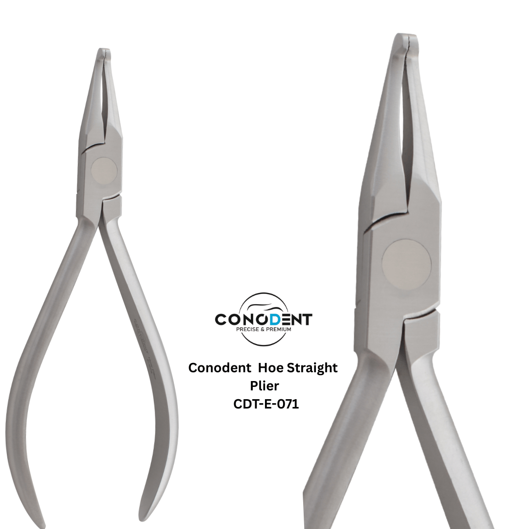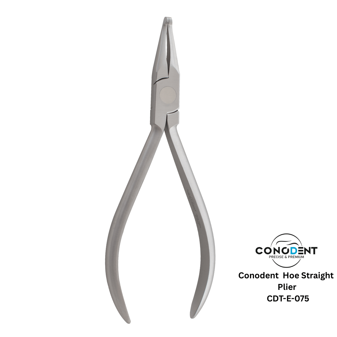 The CONODENT Hoe Plier Straight (CDT-E-075) is a specialized orthodontic instrument designed for the precise bending and adjustment of heavy-duty orthodontic wires. With its robust beak design and straight orientation, this plier provides the necessary torque and stability for creating accurate right-angle bends and finishing adjustments in arch wires and lab appliances.