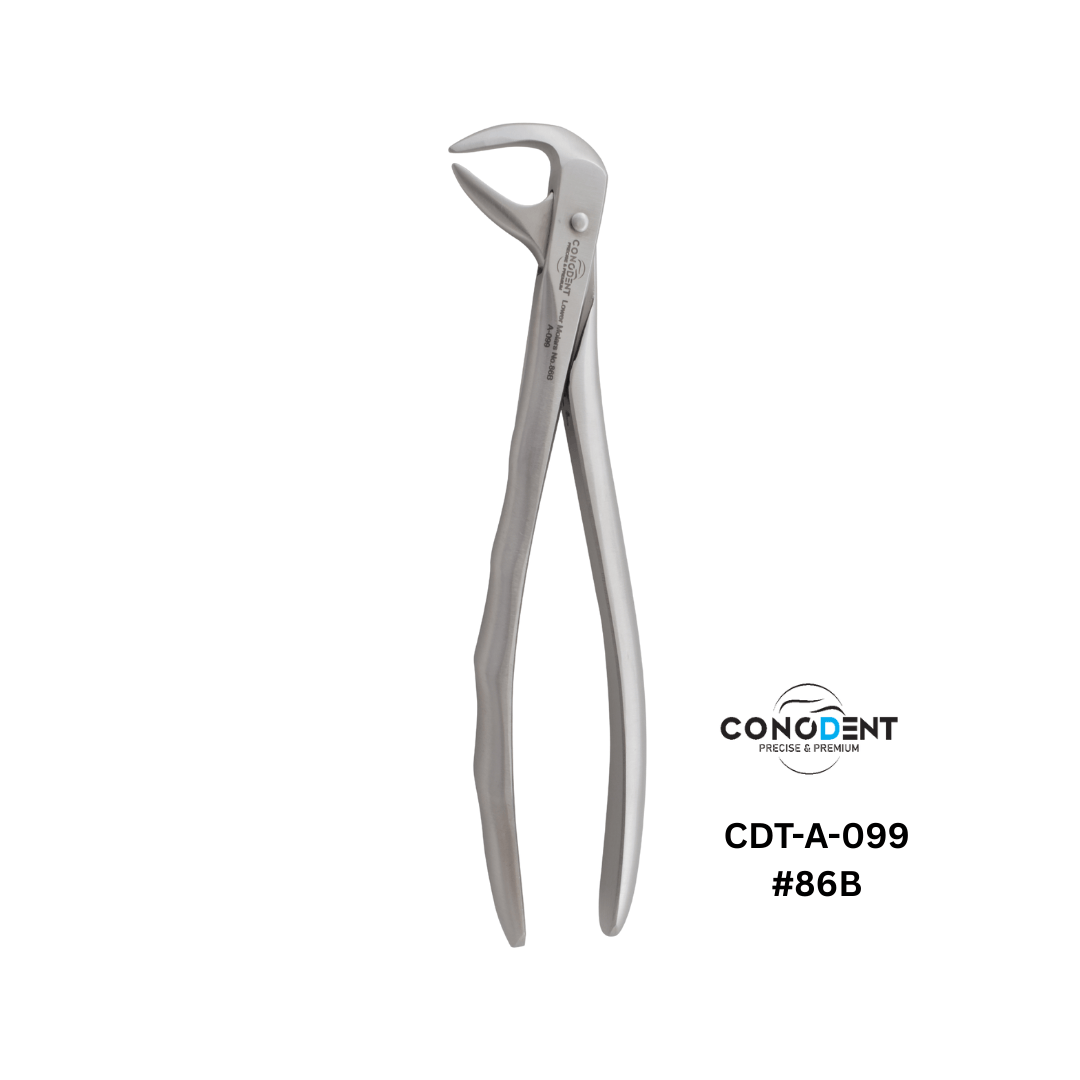 The Conodent Figure 86B “Cowhorn” Forceps combine traditional English Pattern precision with a modern anatomical handle design. Specifically engineered to engage the bifurcation of mandibular molars, this instrument uses a specialized wedging action to elevate teeth efficiently while providing the clinician with superior ergonomic comfort.