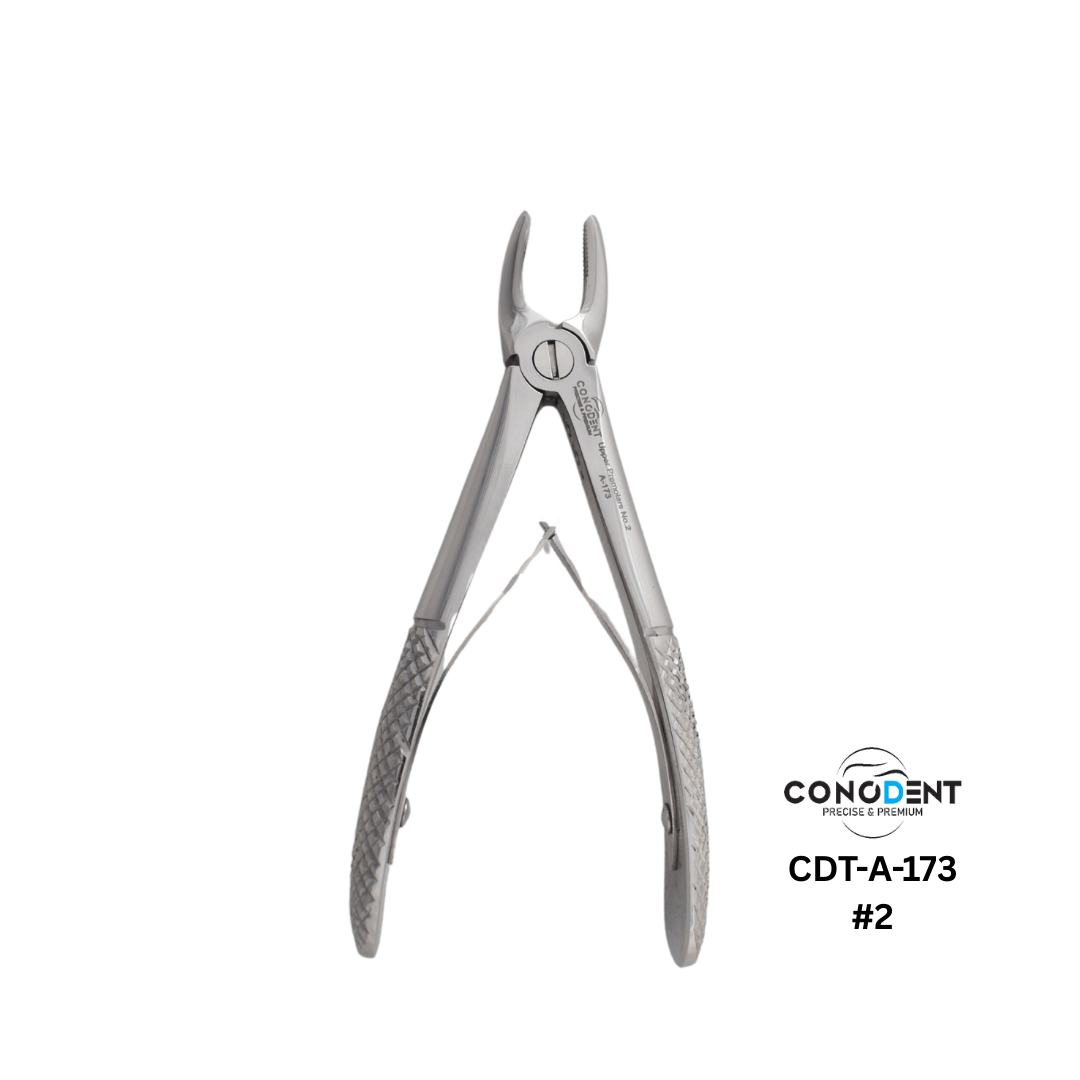 The Conodent Klein Figure 2 Extraction Forceps are a vital component of the pediatric surgical kit. Specifically scaled for the smaller maxillary arch of children, these forceps are designed to provide a secure, anatomical grip on primary (deciduous) upper molars, ensuring a swift and atraumatic extraction process.