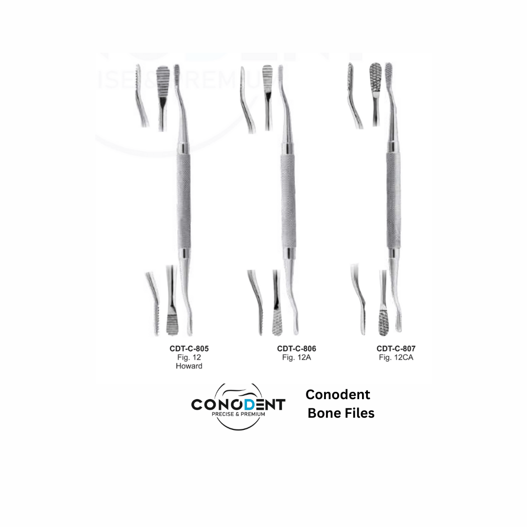The CONODENT Premium Bone File range is engineered for the final smoothing and shaping of bone following extractions or during alveoloplasty. These instruments are essential for removing sharp spicules or "bone spurs" that could cause patient discomfort under a prosthesis or interfere with soft tissue healing. Featuring a specialized 10mm Hollow Handle, these files offer unparalleled tactile sensitivity and ergonomic comfort.