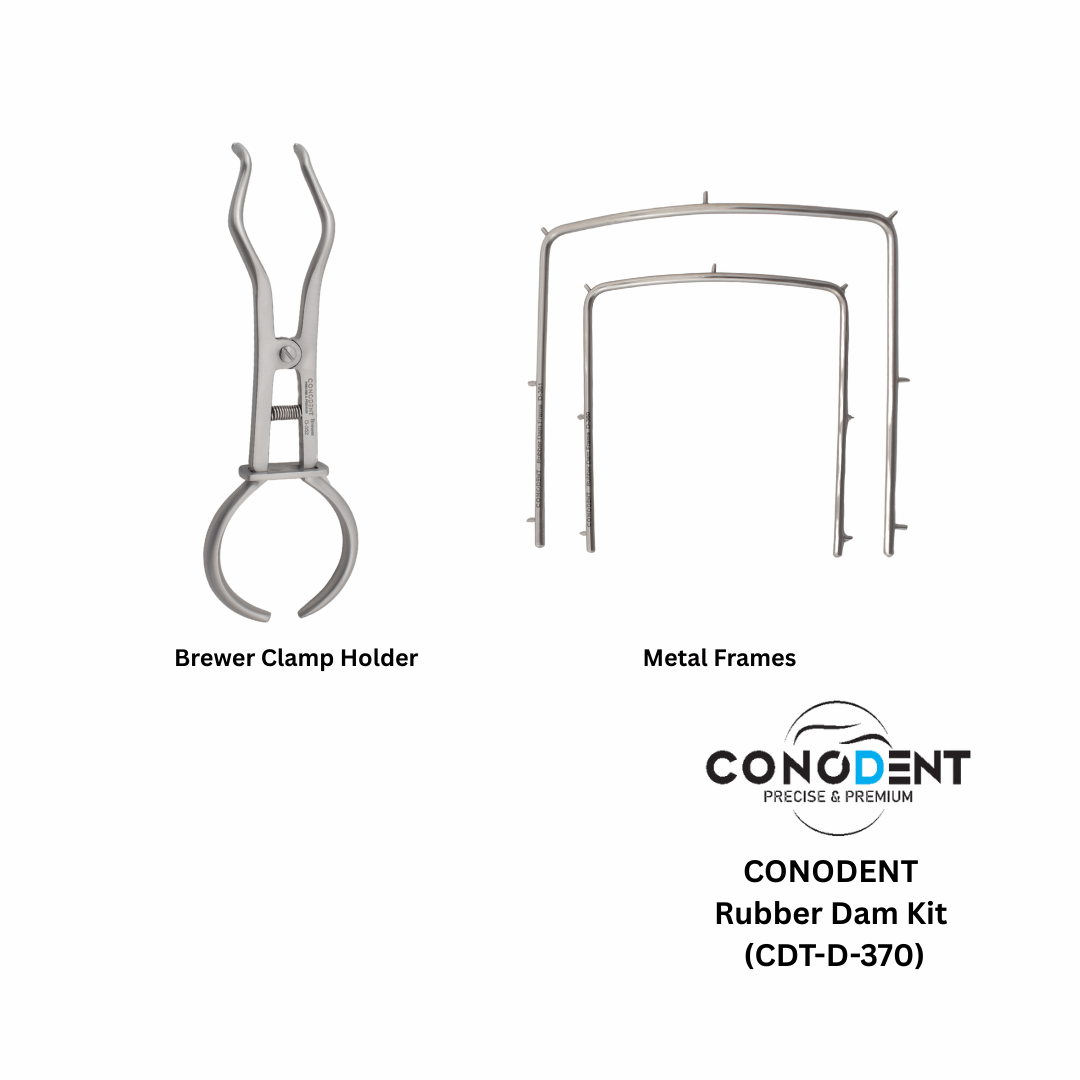 The CONODENT CDT-D-370 Rubber Dam Kit is a comprehensive isolation solution designed to provide a dry, sterile, and highly visible surgical field. This premium set includes the most trusted patterns for tooth isolation—the Ainsworth and Ivory punches—alongside a precision-calibrated Brewer clamp forcep and a versatile range of 11 anatomical clamps.