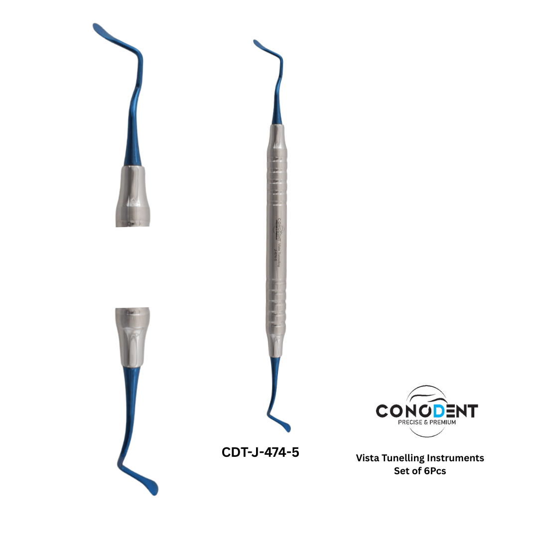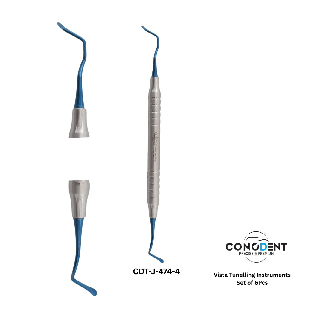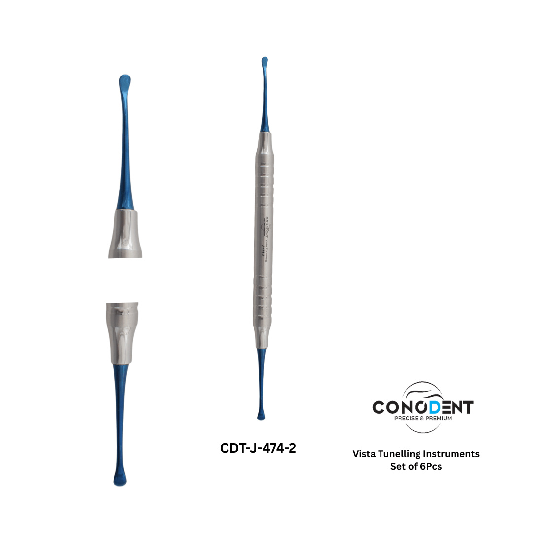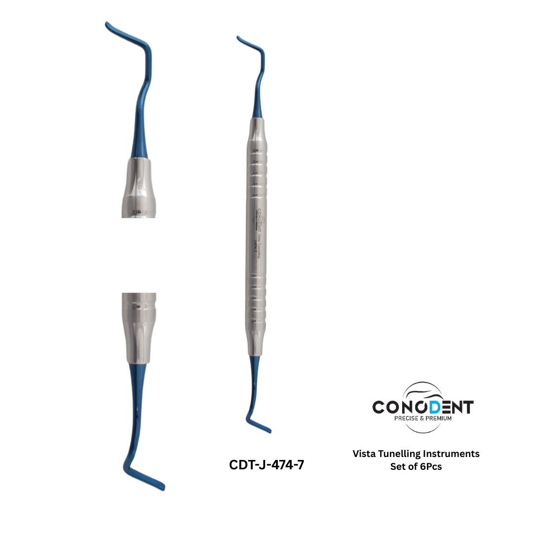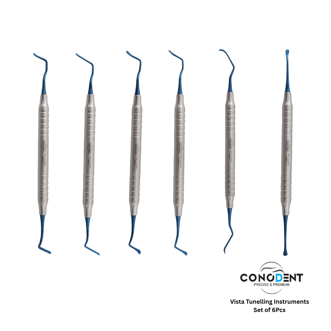 The CONODENT Vista Tunneling Kit (CDT-J-474-1) is a specialized collection of six microsurgical instruments designed for the VISTA (Vestibular Incision Subperiosteal Tunnel Access) technique and other minimally invasive mucogingival procedures. This set is essential for clinicians performing soft tissue grafting and gingival recession coverage where preserving the interdental papilla and avoiding vertical incisions are critical for esthetic success.