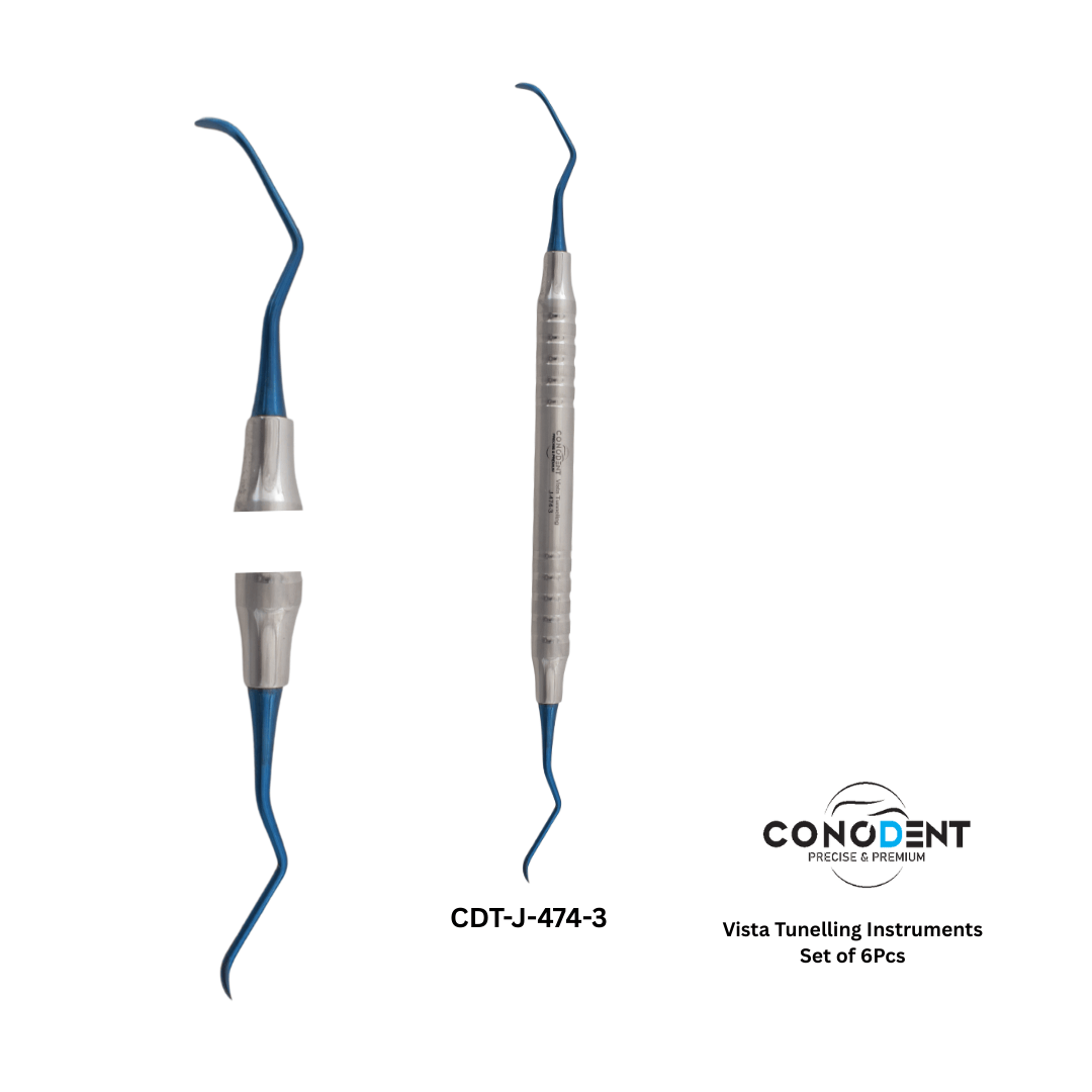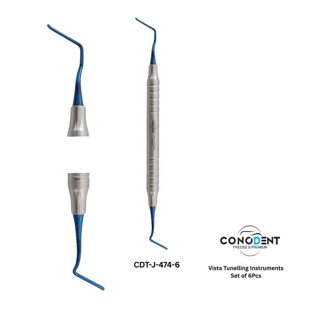 The CONODENT Vista Tunneling Kit (CDT-J-474-1) represents the pinnacle of periodontal microsurgical instrumentation. This specialized 6-piece set is specifically engineered for the VISTA Technique and other advanced tunneling procedures. By combining Hollow-Handle ergonomics with a premium Plasma Coating, we provide clinicians with an instrument that is incredibly lightweight yet remarkably durable for the most delicate soft-tissue reconstructions.